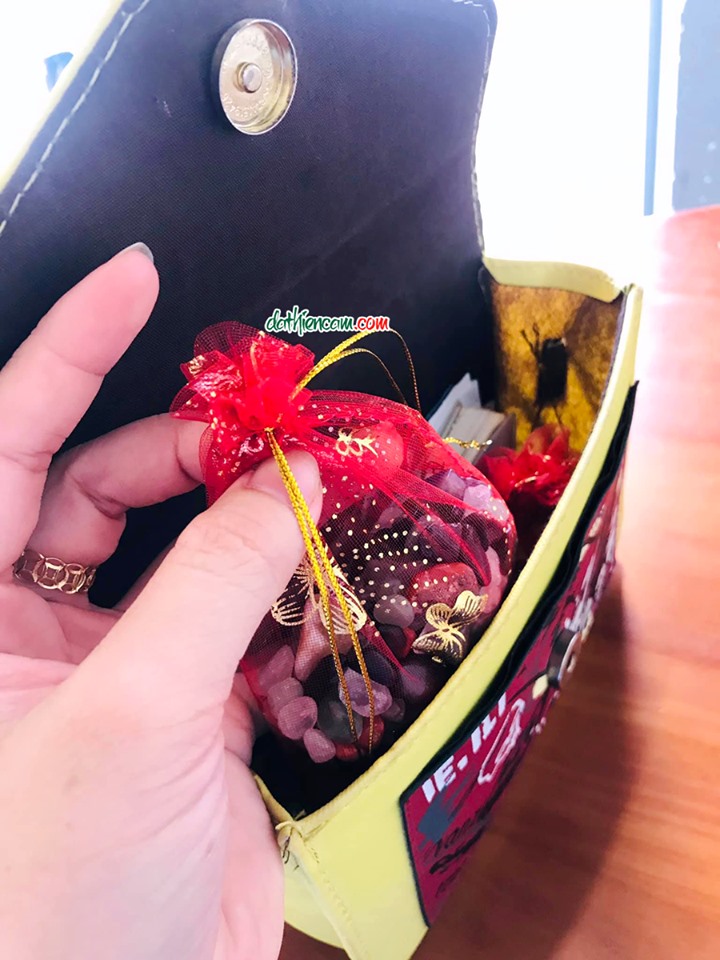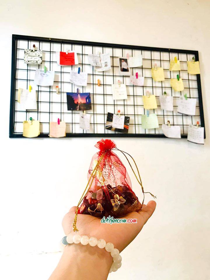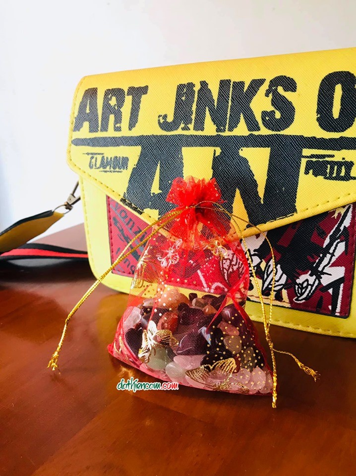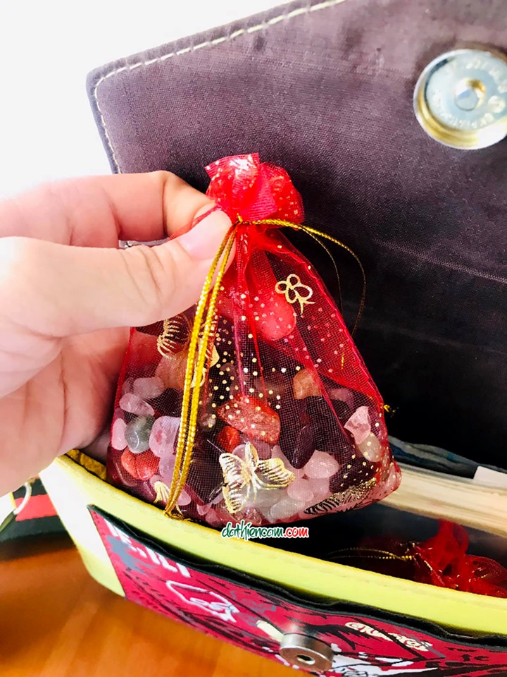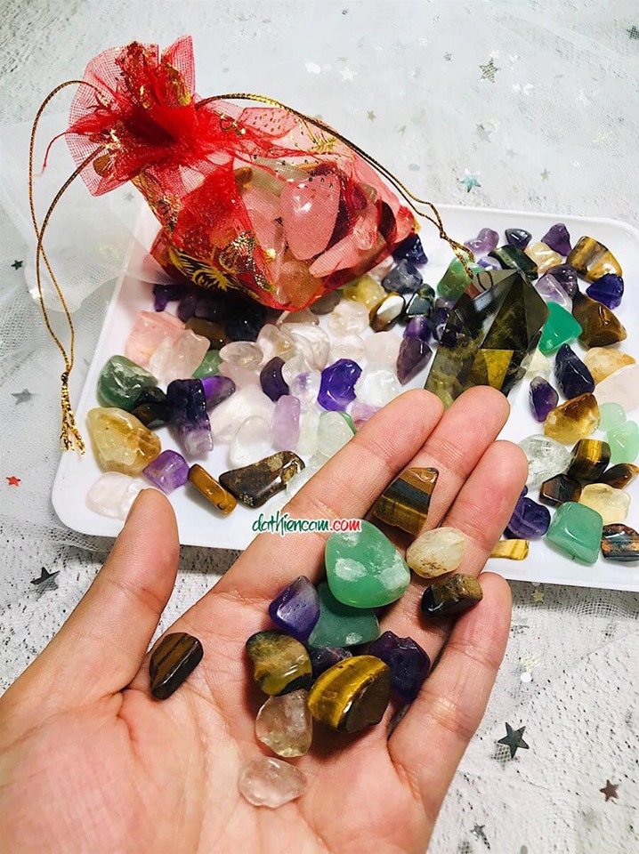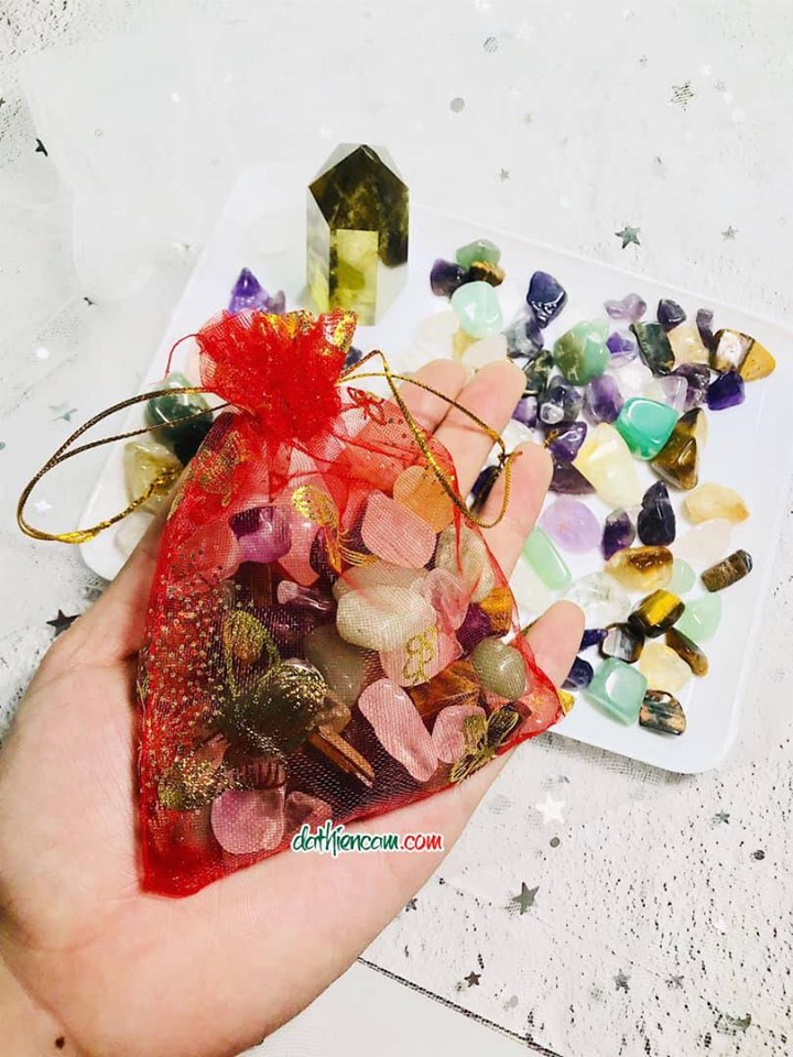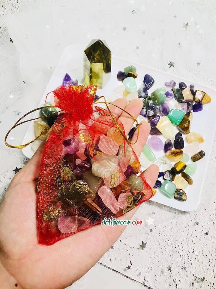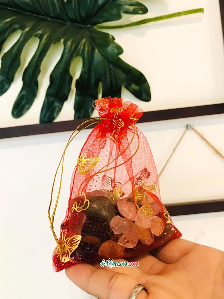 Túi đỏ chứa 6 loại đá thạch anh : Thạch anh trắng, Thạch anh hồng, Thạch anh tím,Thạch anh vàng,Thạch anh xanh, Đá mắt hổ....mang theo bên mình, năng lượng từ các loại đá sẽ giúp xua tan những điều xui xẻo, mang lại bình an và may mắn